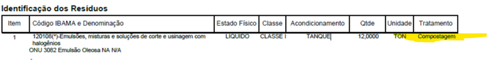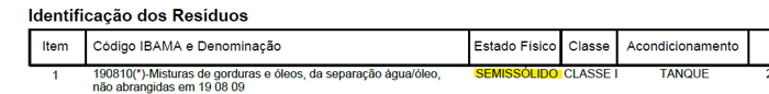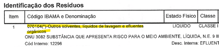 Código IBAMA e Denominação: O gerador deve selecionar a denominação que de fato descreve o seu efluente. Não utilize denominações genéricas se o seu efluente não corresponder, de fato, a solventes, líquidos de lavagem ou efluentes orgânicos: